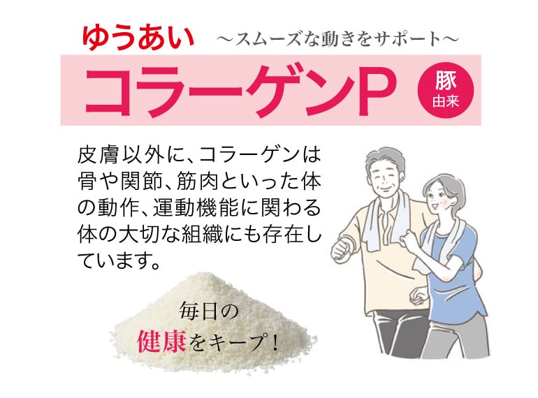 ゆうあい コラーゲンPは、スムーズな毎日のために、豚皮由来のコラーゲンペプチドを使用。